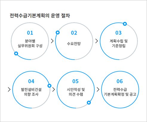 때문에 전력수급기본계획 수립은 ‘분야별 실무위원회 구성→수요전망 계획수립 및 기준정립→발전설비건설 의향 조사→시안작성 및 의견 수렴→계획확정 및 공고’ 등 여러 단계를 거쳐 면밀하게 이루어진다.